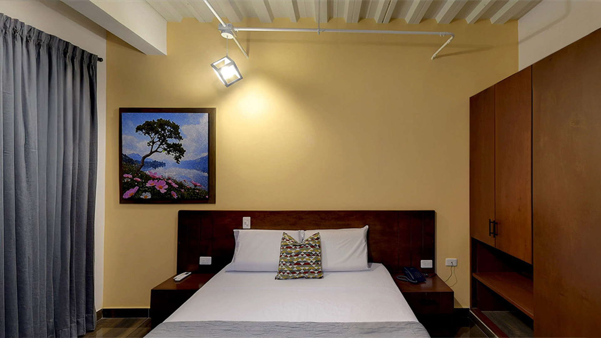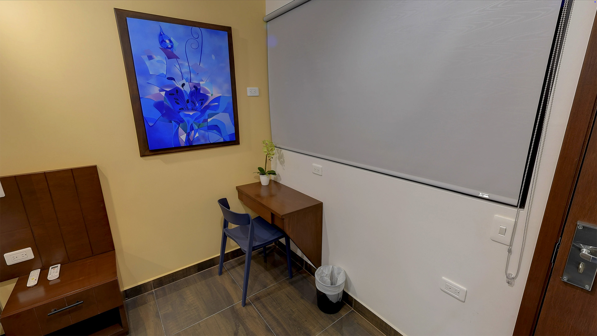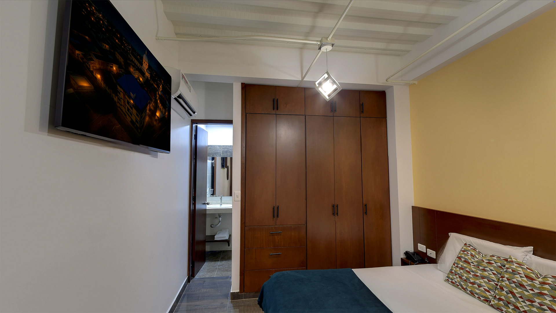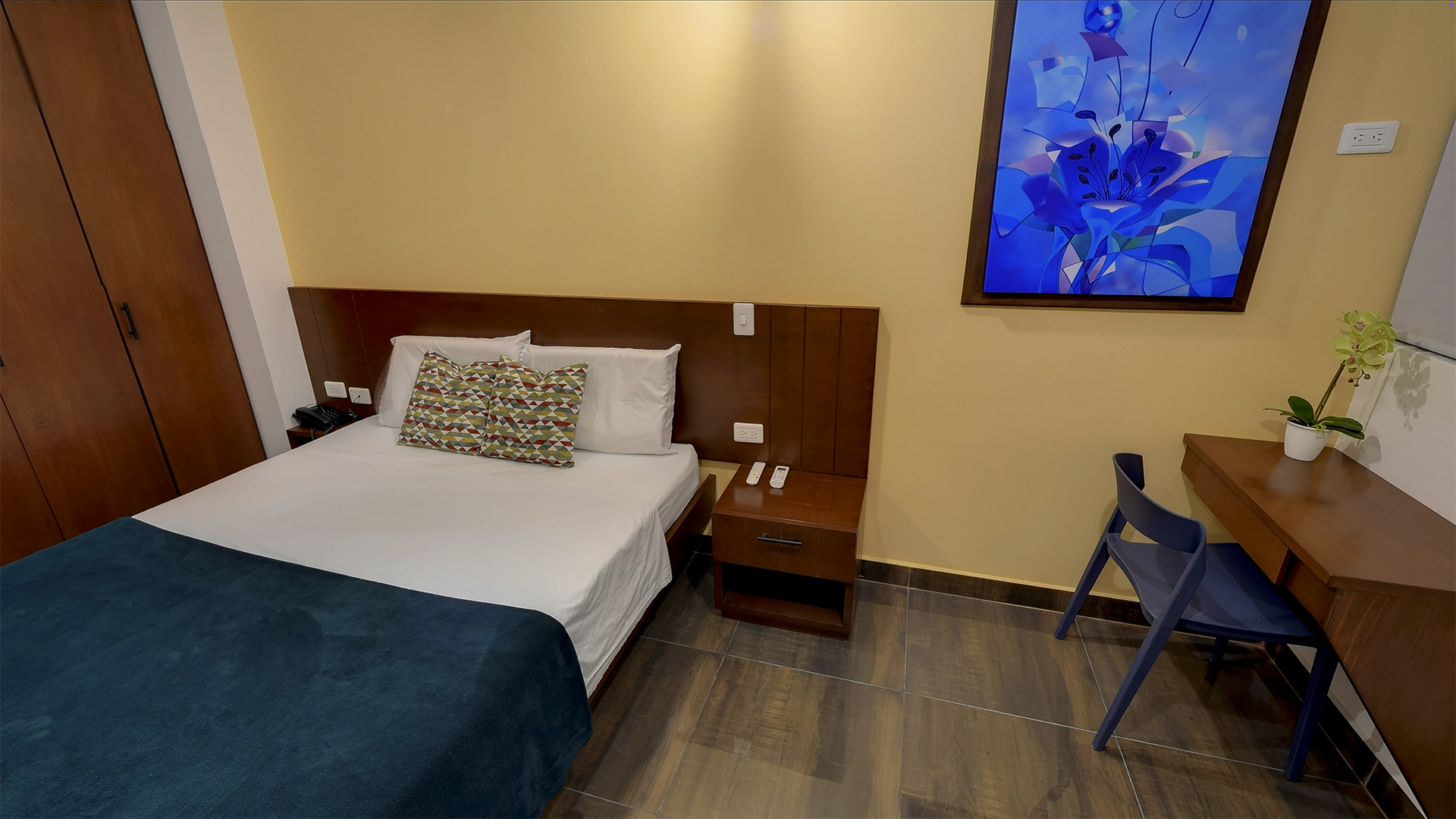 Nuestro Habitación Estándar combina diseño moderno y funcionalidad en un espacio acogedor y bien distribuido. Ideal para quienes viajan por negocios o en pareja, ofrece un ambiente tranquilo para descansar y trabajar, con todas las comodidades necesarias para una estancia agradable en Buga. A solo pasos de la emblemática Basílica del Señor de los Milagros, este espacio te conecta con la riqueza cultural y espiritual de la ciudad, sin sacrificar comodidad ni estilo.
